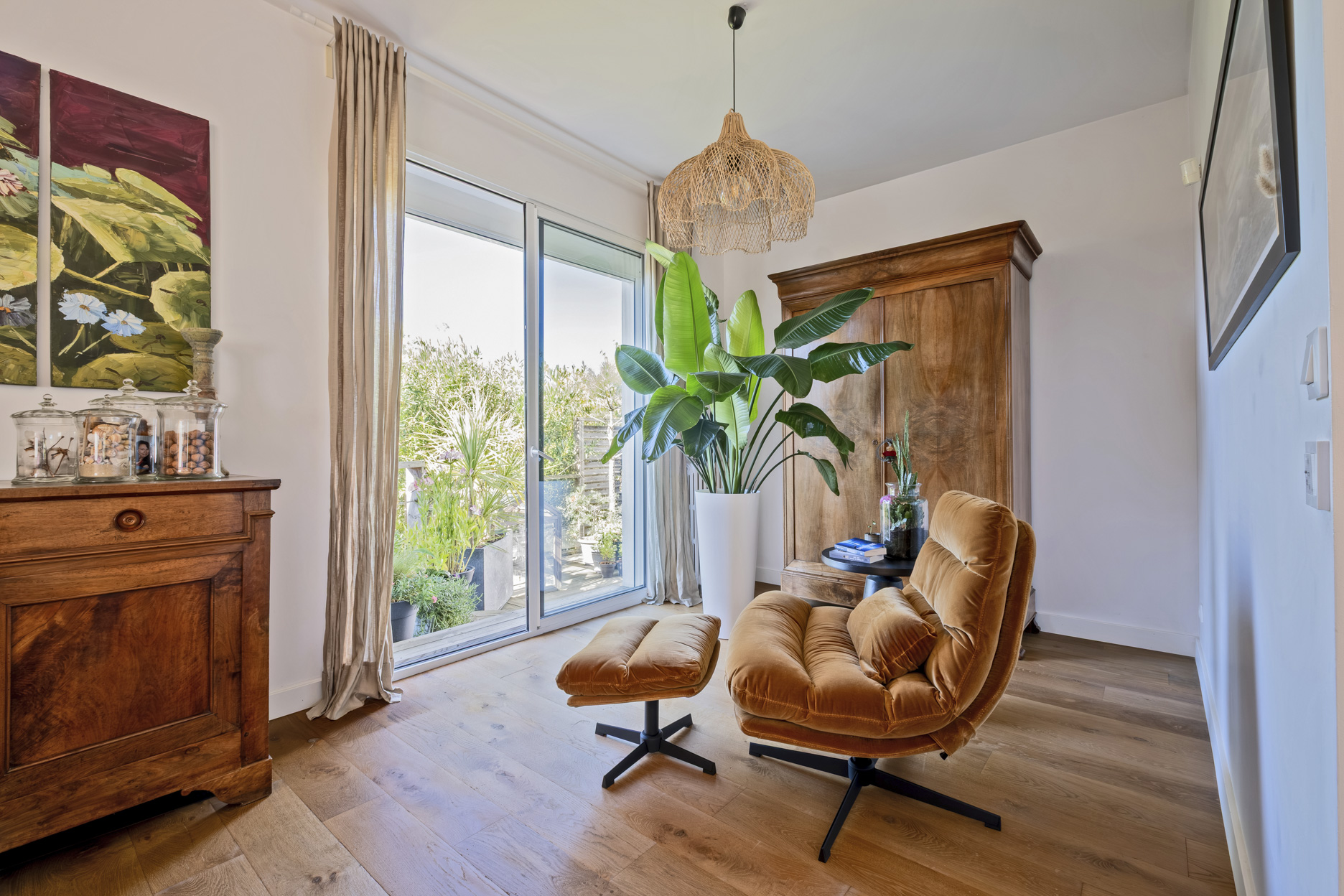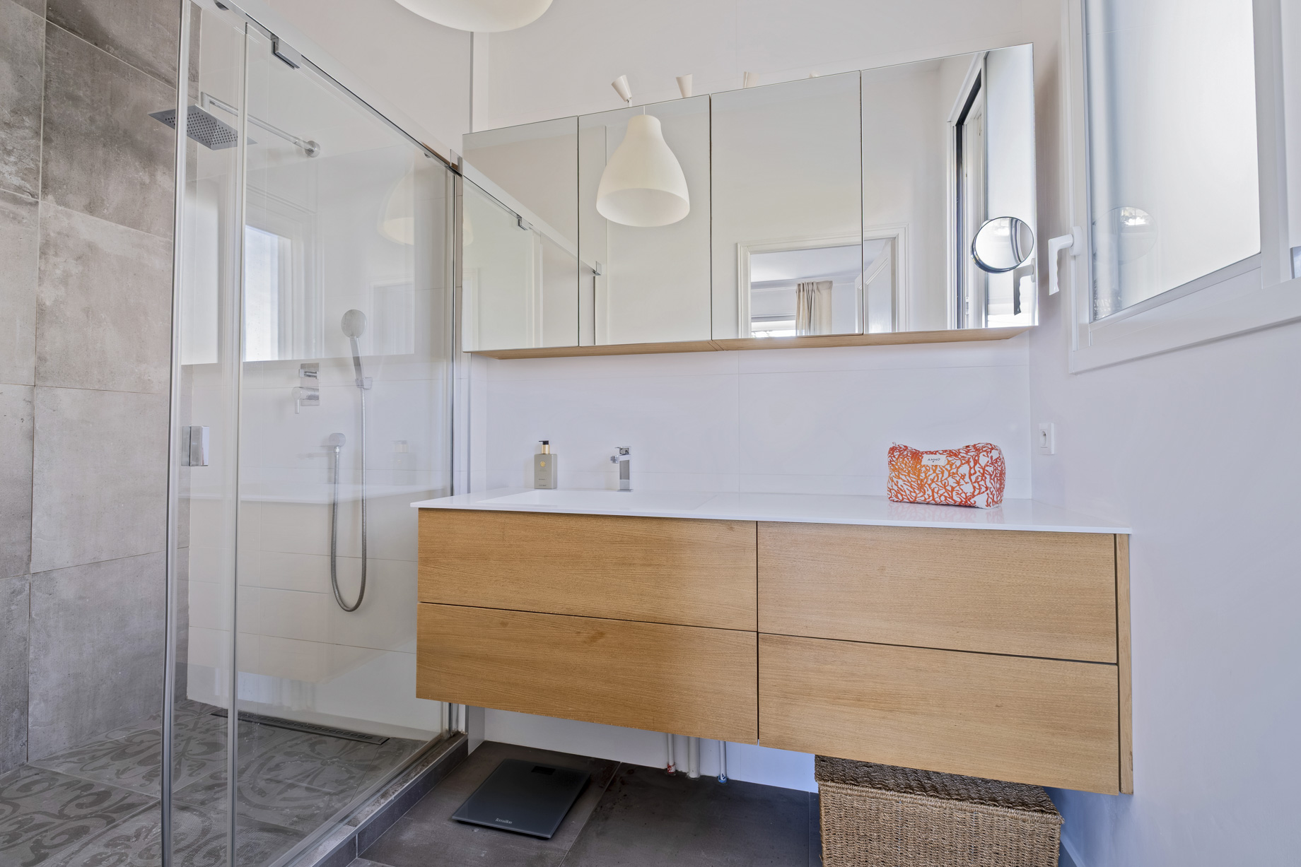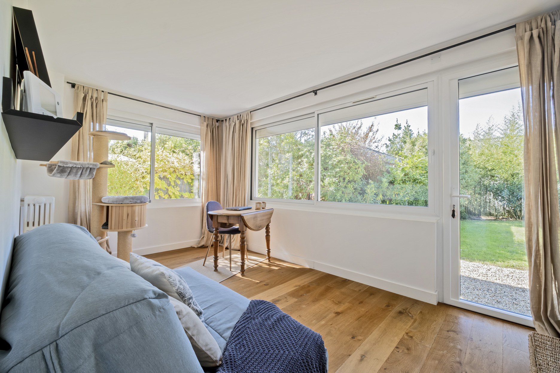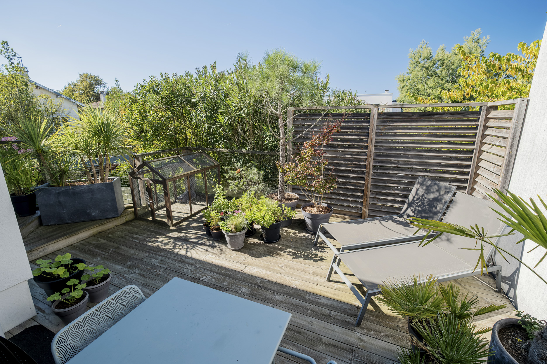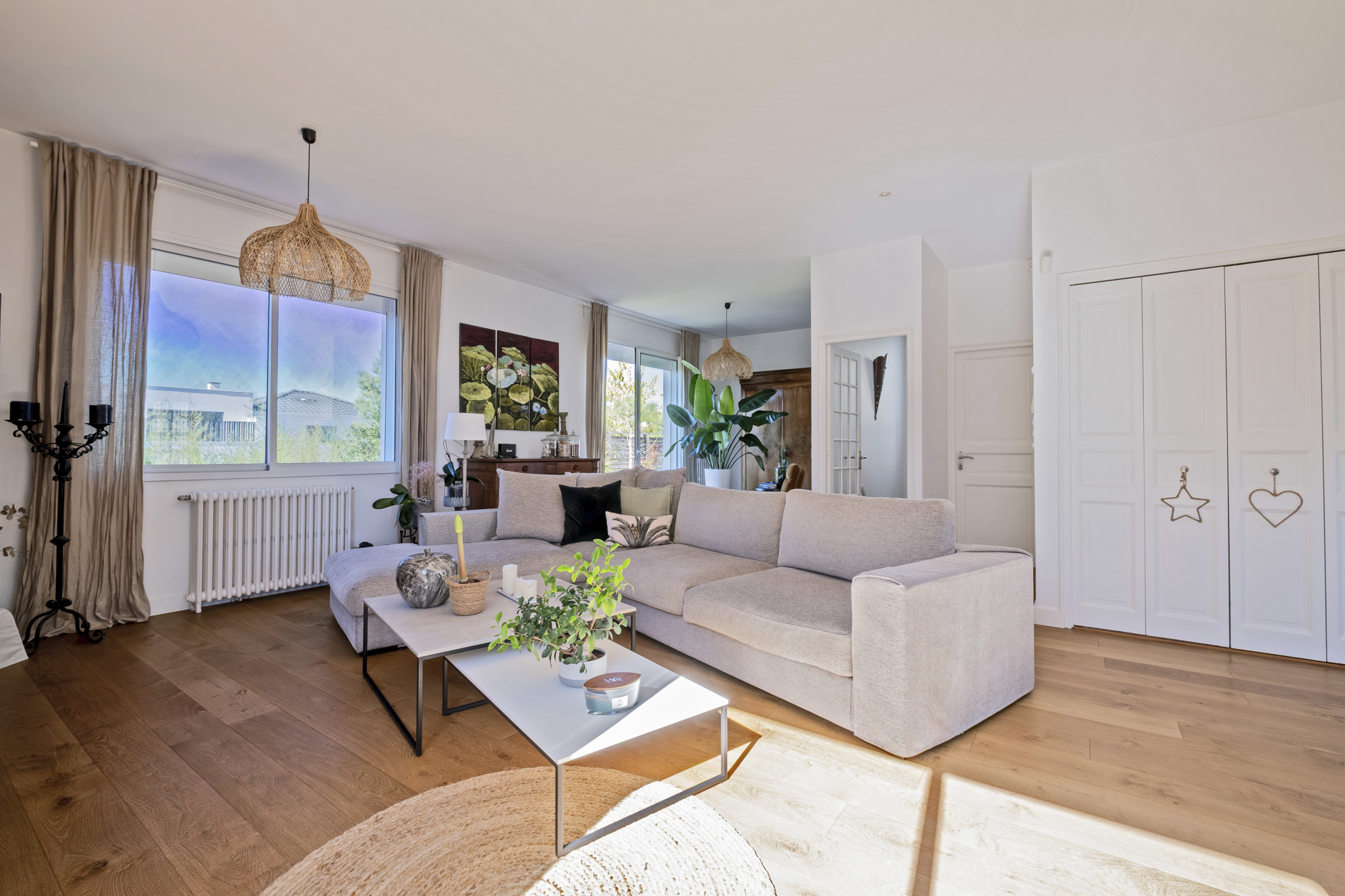 L’entrée ouvre sur une belle pièce à vivre lumineuse grâce à sa triple exposition et propose une cuisine dinatoire ouverte et un espace salon séjour qui donne sur une terrasse de 20 m² surplombant le jardin clos et arboré.