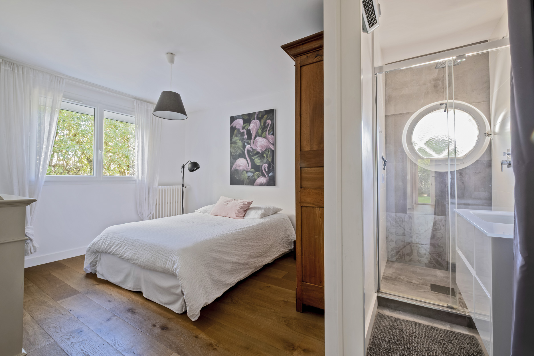 Un escalier descend au rez-de-chaussée qui comprend 2 chambres, 2 salles d’eau, un bureau pouvant faire office de chambre, un grand dressing, une buanderie et un garage avec nombreux rangements.
