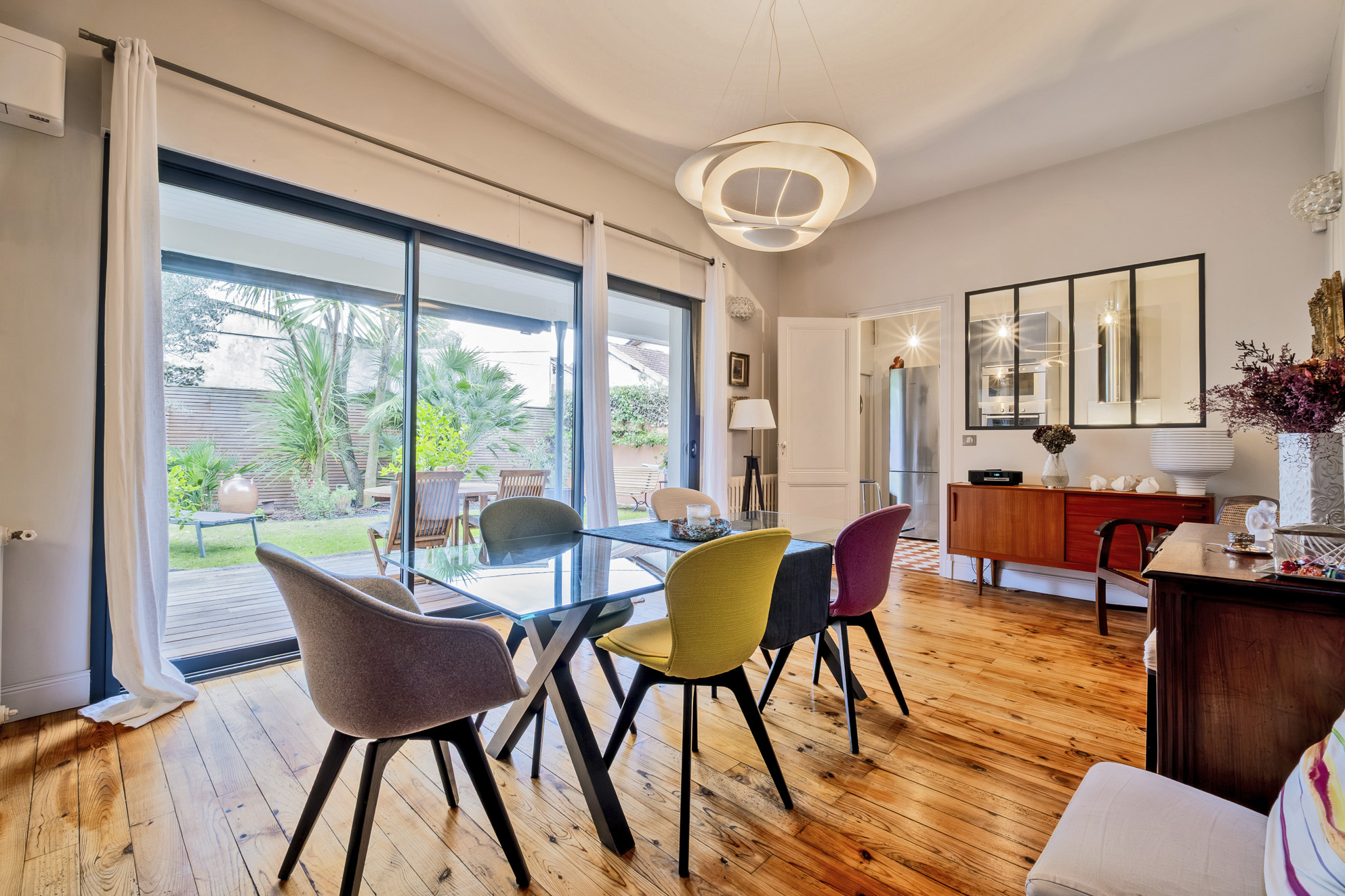 L’entrée dessert une chambre de plain-pied avec une une salle d’eau, un bureau pouvant faire office de chambre et mène à la salle-à-manger ouverte sur une terrasse dinatoire de 20 m². Dans le prolongement, un salon lumineux avec plusieurs ouvertures sur le jardin et la piscine.