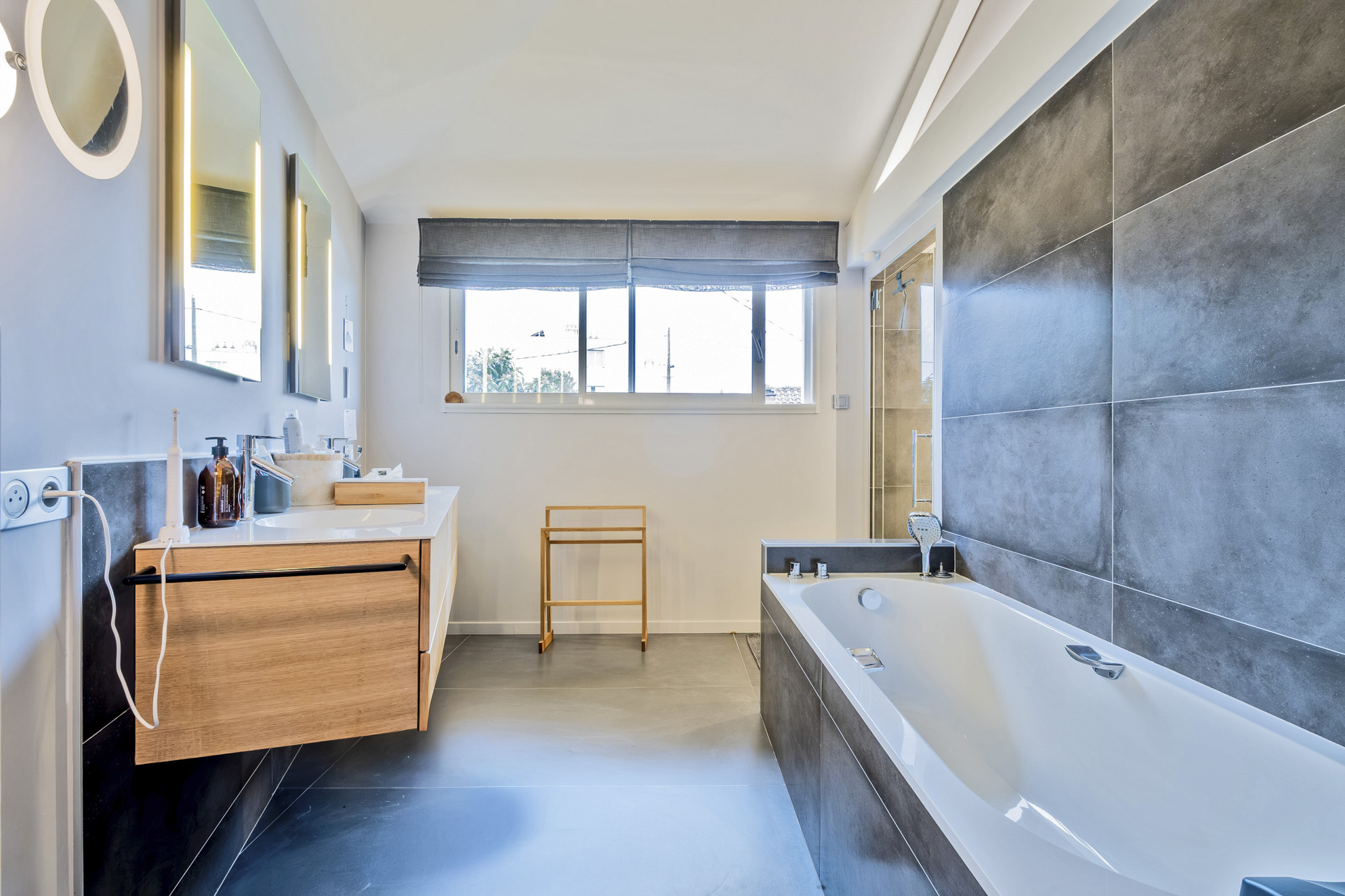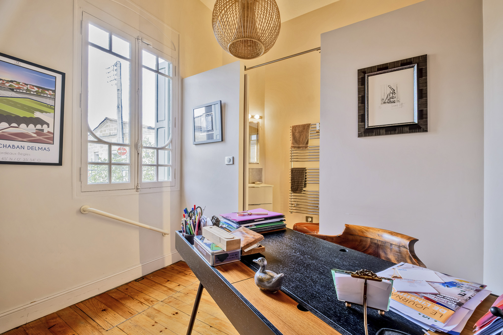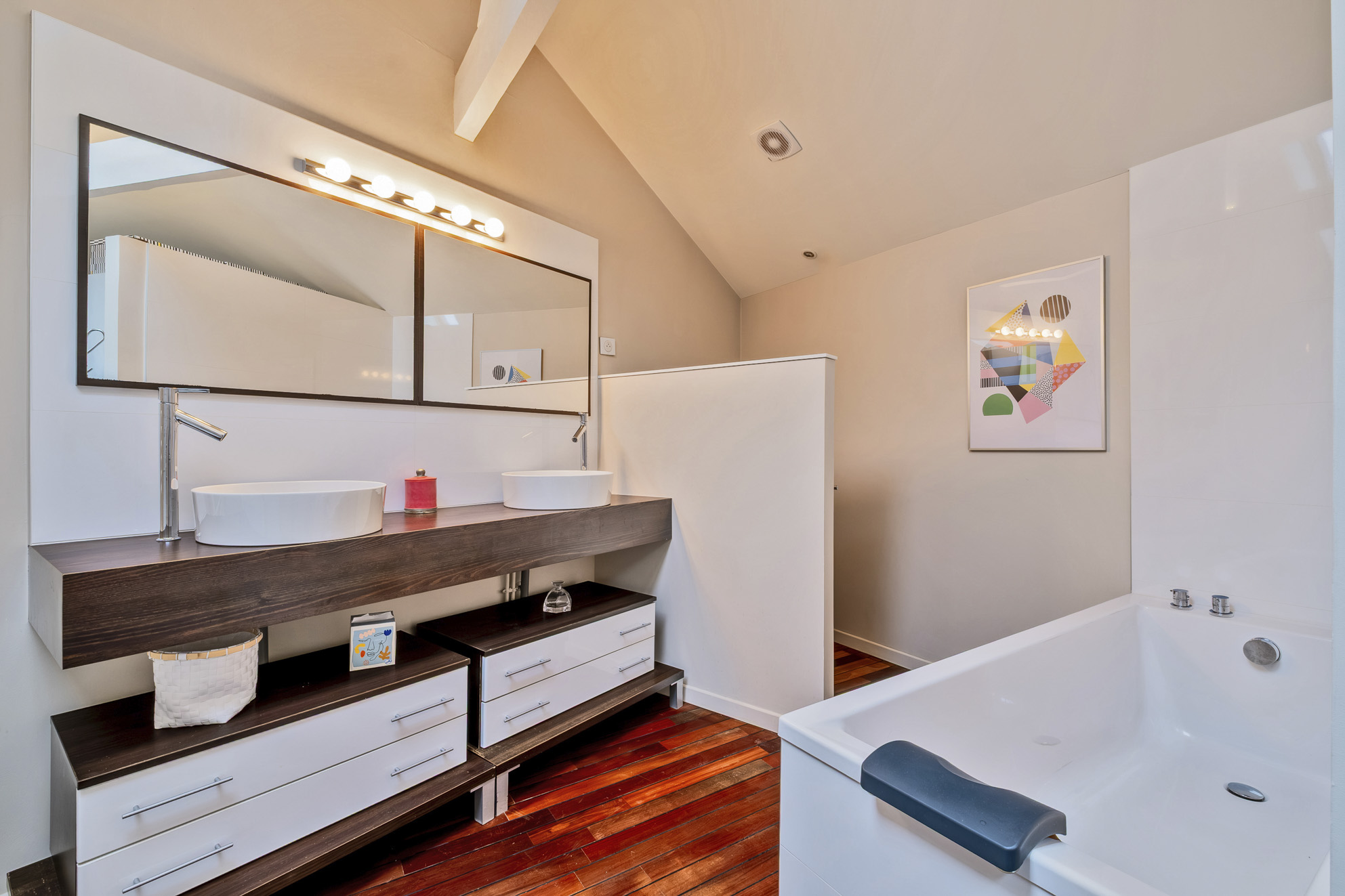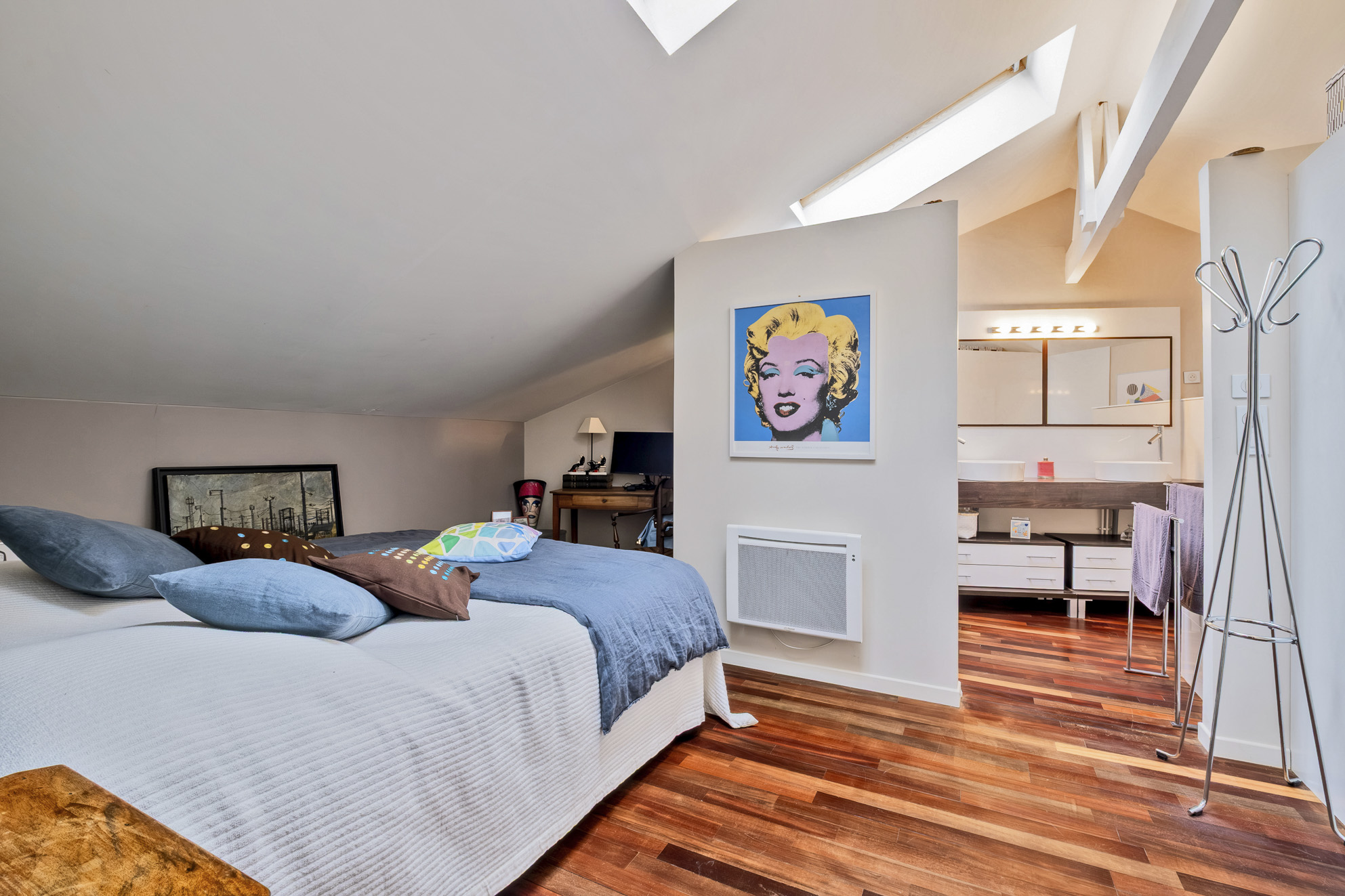 Dans les étages, deux espaces séparés traités en suites parentales de près de 30 m² chacune avec salle d'eau ou salle de bains, dressing et espace bureau.